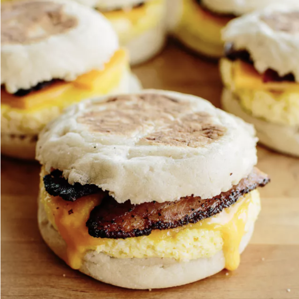 - Assemble the sandwiches: Lay the bottom halves of the English muffins in a row on your counter. Top each one with an egg round, a slice of cheese, and 2 pieces of bacon (if using). Finish by adding the muffin tops.