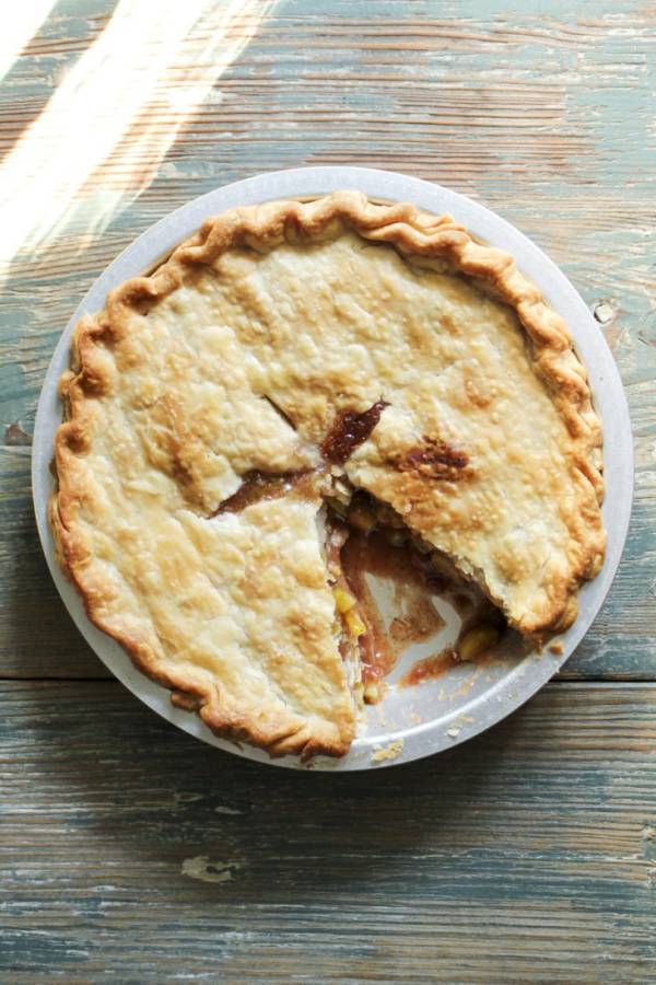 - Line the bottom of a 9-inch pie plate with crust. Dump the zucchini mixture, juices and all, into the crust, and dot with 4 tablespoons of butter, cut into small bits. Cover with the top crust, turning the edges under and crimping. Cut several vents in the top with the tip of a sharp knife, then scatter the remaining pieces of butter over the crust.