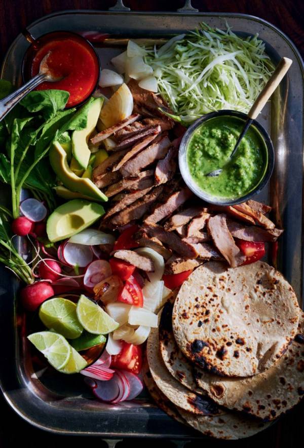 - Stoke the fire to get it really hot again. Clean the grill grates well with a brush and oil them lightly with a bit of vegetable oil on a towel. Wipe off any of the crushed spices from the pork and lay on the hottest parts of the grill. Grill pork for 3 to 4 minutes per side, getting some good grill marks. Once both sides are seared, remove to a cutting board and let rest for a couple of minutes. Slice thinly and serve over the cabbage, with the roasted onion, avocado, tomato (season the avocado and tomato with a sprinkle of salt), radishes, warmed tortillas, and salsas.