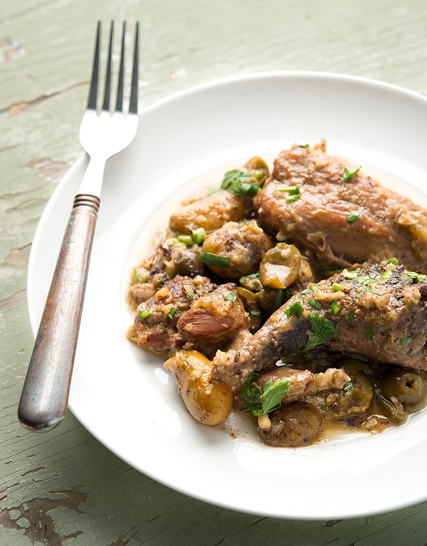 - After 45 minutes, take the pot out and add the sliced onion, the olives and the potatoes. Mix everything together. If the stew looks too dry, add a little more broth – but remember this is a “dry stew,” not a soup. I eat this with a fork and a piece of bread, not a soup spoon. Add just enough broth to keep everything from drying out. Cover the pot again and return to the oven for at least another 45 minutes, maybe an hour. Check the meat and potatoes: The squirrel should be thinking about falling off the bone and the potatoes should be cooked through. When this is done, turn the heat off and let it cool – covered – for 10 minutes on the stovetop.