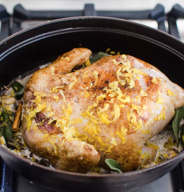 - Add the cinnamon stick and garlic to the pot, and allow them to sizzle in the oil for a minute or 2, then return the chicken to the pot along with the milk and sage leaves. Use a vegetable peeler to cut wide strips of skin off the two lemons, and add them to the pot as well. Slide the pot into the oven, and bake for approximately 1½ hours, basting the chicken occasionally, until the chicken is cooked through and tender and the sauce has reduced into a thick, curdled sauce. (If the sauce is reducing too quickly, put a cover halfway onto the pot.)