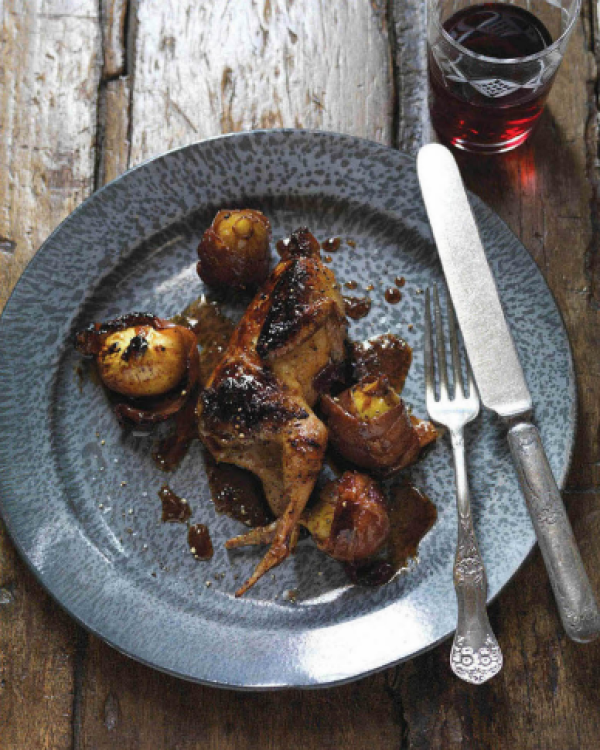 - Meanwhile, wrap each pickled fig with a slice of the prosciutto. Grill or broil until the prosciutto is lightly browned, about 3 minutes. Serve alongside the quail with a little drizzle of strained fig cooking liquid.