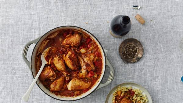 - Add half of kimchi and nestle bacon and chicken, skin side up, into tomatoes (make sure chicken skin is above surface of liquid to keep it crispy). Bring to a simmer and cook, reducing heat if needed, until chicken is tender and cooked through, 45–60 minutes.