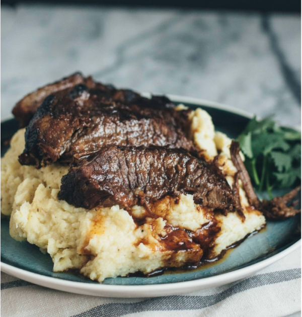 - Slice the brisket on a bias and serve it with your favorite whipped veg (this recipe for Creamy Whipped Parsnips shown here) and drizzle with the reduced sauce.