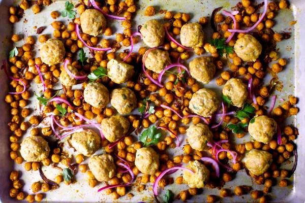 - Remove sheet pan with chickpeas from the oven (leave oven on) and move the chickpeas to the sides of the chickpeas to the outer edges of the baking sheet. Lightly coat center with a thin coat of oil, either brush or spray it on, just to be safe. Place baking sheet in oven and bake 10 to 15 minutes, or until meatballs are cooked through.