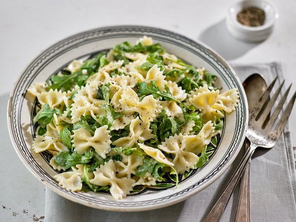 - Tear arugula into bits, or use a scissors to cut it. Pieces should not be too small. Cook pasta until it is tender but not mushy. Remove and reserve a little cooking water, then drain pasta and toss it with arugula and cheese mixture, adding a bit of water if mixture seems dry.