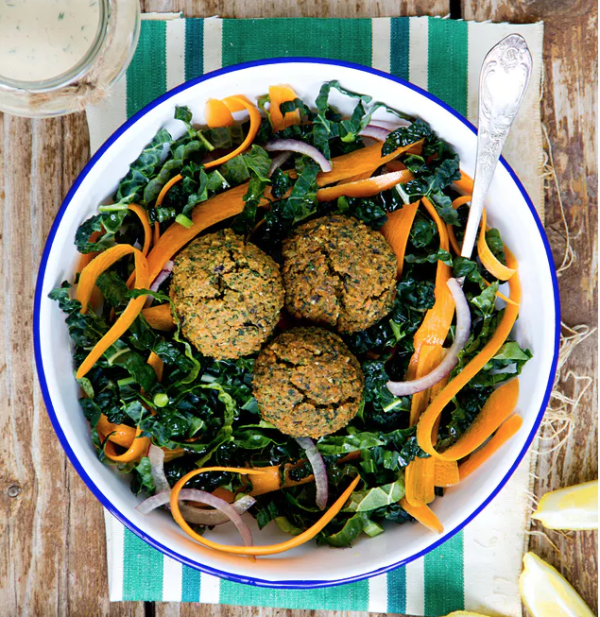 - To serve, plate the falafels over a bed of kale-carrot salad with a heaping dollop (or two) of tahini dressing.