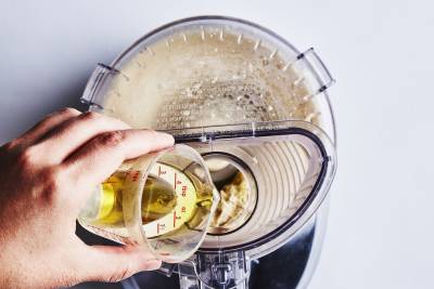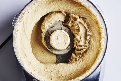 With the motor running, stream in 3 Tbsp. oil, then continue to process until hummus is very light and creamy, about 1 minute longer. Taste and season with salt, if needed.