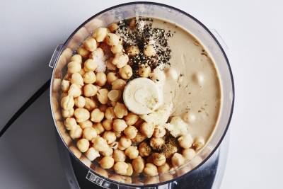 Process chickpeas, tahini, lemon juice, garlic, salt, pepper, cumin, and 2 Tbsp. water in a food processor until smooth, about 1 minute (or you can use a blender).