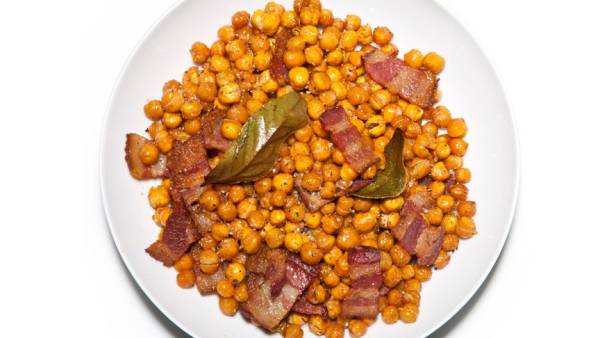 - Toss chickpeas with bacon and bay leaves on a rimmed baking sheet; season with salt and pepper.