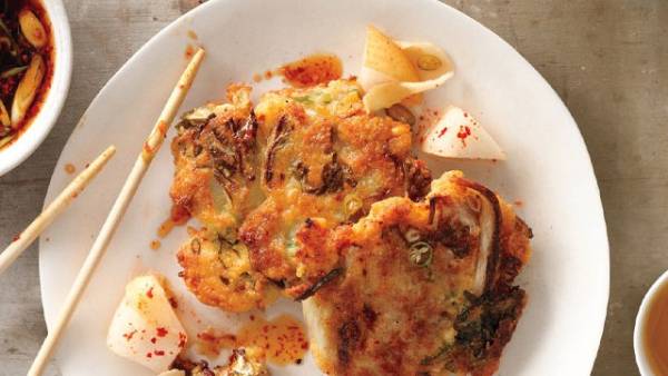 - Drain beans, reserving 1 cup soaking liquid. Purée beans and 1/2 cup soaking liquid in a blender, adding more water by tablespoonfuls if necessary, until mixture is a thick, slightly chunky paste. Transfer to a large bowl. Add 3/4 cup scallions, 1 tsp. garlic, kimchi, and chile to bean purée. Mix well; season batter with salt. Stir in pork mixture.