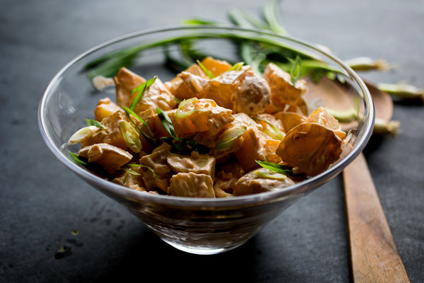 - Transfer hot potatoes to a large bowl and toss with 2/3 of the dressing. Let cool to room temperature, or refrigerate until ready to use. Just before serving, toss with remaining dressing. Adjust seasoning if necessary. Garnish with scallion greens and more lime juice to taste.