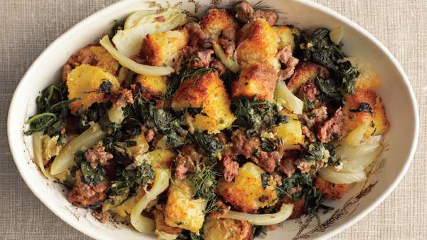 - Preheat oven to 350°. Butter a 3-qt. shallow baking dish. Whisk eggs to blend in a large bowel; whisk in broth. Stir in sausage, the onion-fennel mixture, spinach, salt, pepper, and fennel seeds. Add bread; toss until evenly distributed and bread has absorbed the liquid. Transfer to prepared dish; dot with remaining 2 Tbsp butter.