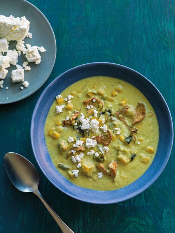 - 3. While the soup is heating, in a fry pan over medium heat, melt the butter. Add the remaining chiles, the remaining corn and the mushrooms and stir well. Season to taste with salt and pepper and sauté until the mushrooms release their liquid and their liquid evaporates, about 8 minutes (or longer if you are using cremini).
