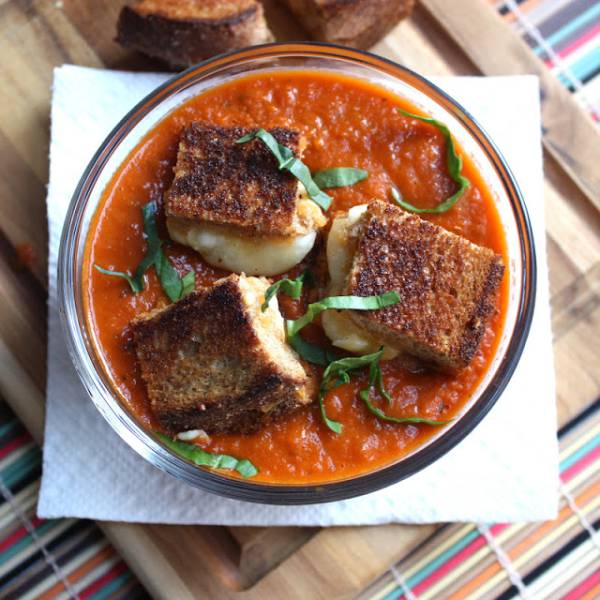 Roasted Tomato-Basil Soup with Grilled Cheese Croutons