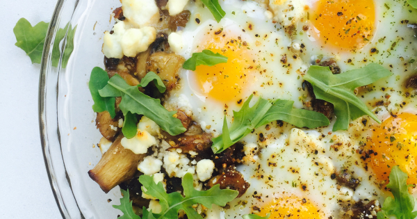 4. Grease four 8 ounce ramekins with butter. Crumble cheese and divide among them. Gently crack two eggs into each ramekin, careful not to break the yolks. Add one quarter of the mushroom mixture to each, and top each ramekin with 1 TB of cream.